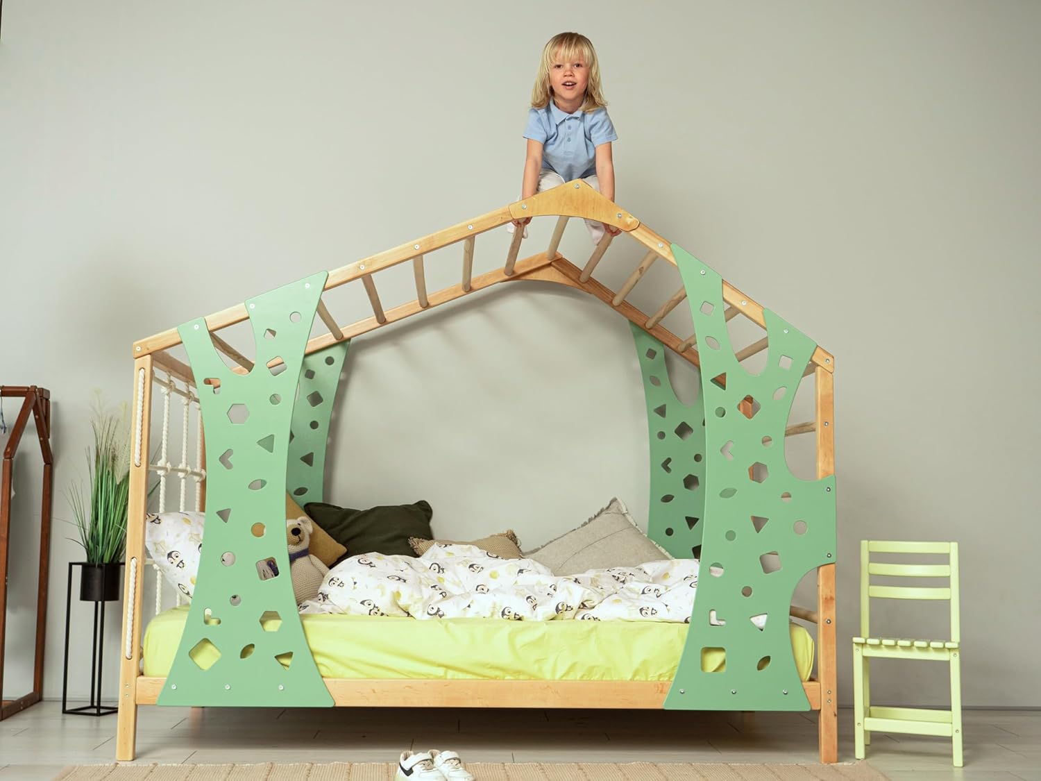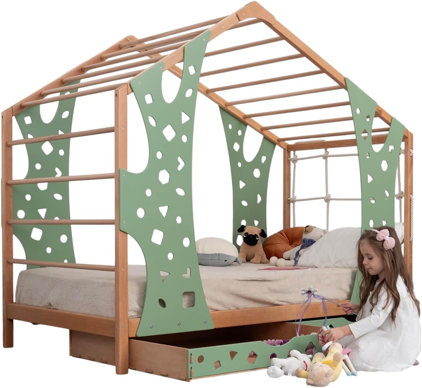 The Monkey Set includes:- 1 Monkey Montessori Bed with Legs & Slats.- Set of 2 Drawers.Monkey Bed available in USA Twin size (75 x 38 inches).The size chosen represents the mattress size, but the outer bed frame will be larger (mattress not included).Maximum weight capacity for the bed: 264.6 lbs (120 kg).Weight capacity for the climbing panels: 220 lbs (100 kg).Recommended mattress thickness: 7.9 inches (20 cm).Drawers Set Dimensions:- 2 Drawers – Width 90 cm x Depth 90 cm- Watch your little one during active play on the sturdy twin bed frame.- Sold disassembled, assembly required (tools included).- 2-year warranty included.