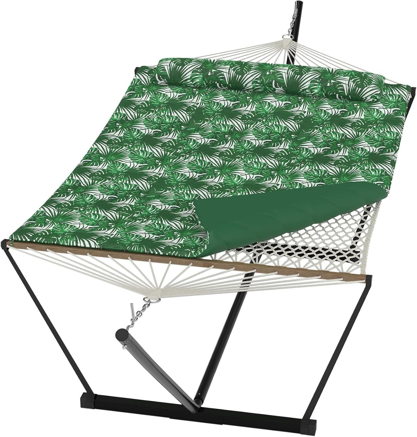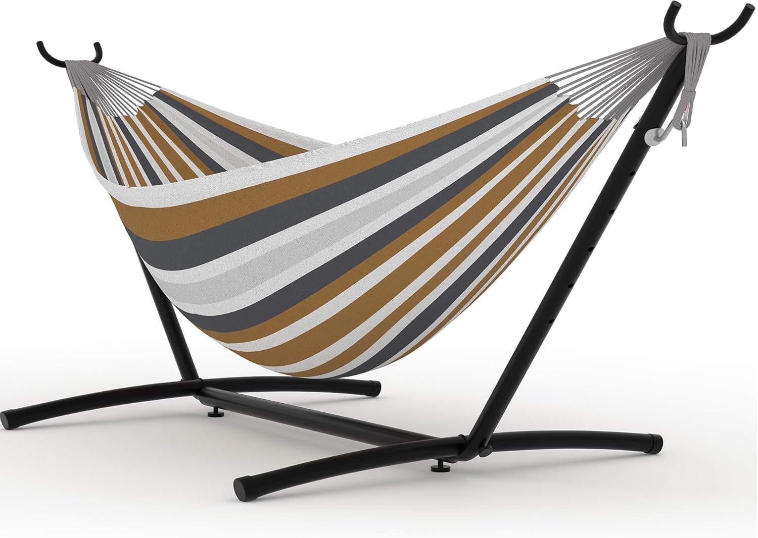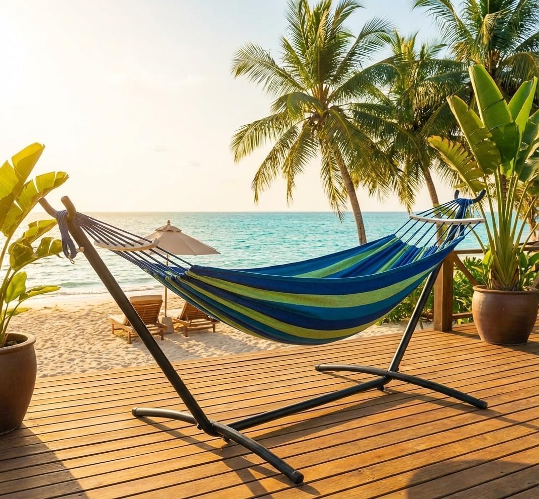Experience ultimate relaxation with our Double Hammock with Stand Curved-Bar Hammock, designed to comfortably support up to 450 pounds. Perfectly crafted for two people, this large hammock offers ample space for lounging, reading, or napping, making it an ideal addition to your backyard, patio, or beach setup. The sturdy curved-bar stand ensures stability and durability, allowing you to enjoy your hammock indoors or outdoors without the need for trees or additional support.Constructed from high-quality, weather-resistant materials, this hammock is built to withstand the elements, ensuring long-lasting use through all seasons. Its breathable fabric provides comfort and ventilation, keeping you cool on warm days. Easy to assemble and disassemble, this hammock set is portable and convenient for any outdoor adventure or indoor relaxation.Key Features:- Spacious double hammock designed for two people with a 450 lbs weight capacity- Sturdy curved-bar stand provides excellent stability and support without the need for trees- Made from durable, weather-resistant materials suitable for indoor and outdoor use- Breathable fabric enhances comfort and ventilation during warm weather- Easy to assemble, disassemble, and transport for versatile use anywhereEnhance your leisure time with this versatile and comfortable double hammock. Whether you want to unwind in your backyard, enjoy a sunny day at the beach, or create a cozy nook indoors, this hammock with stand is your perfect companion for relaxation and comfort.