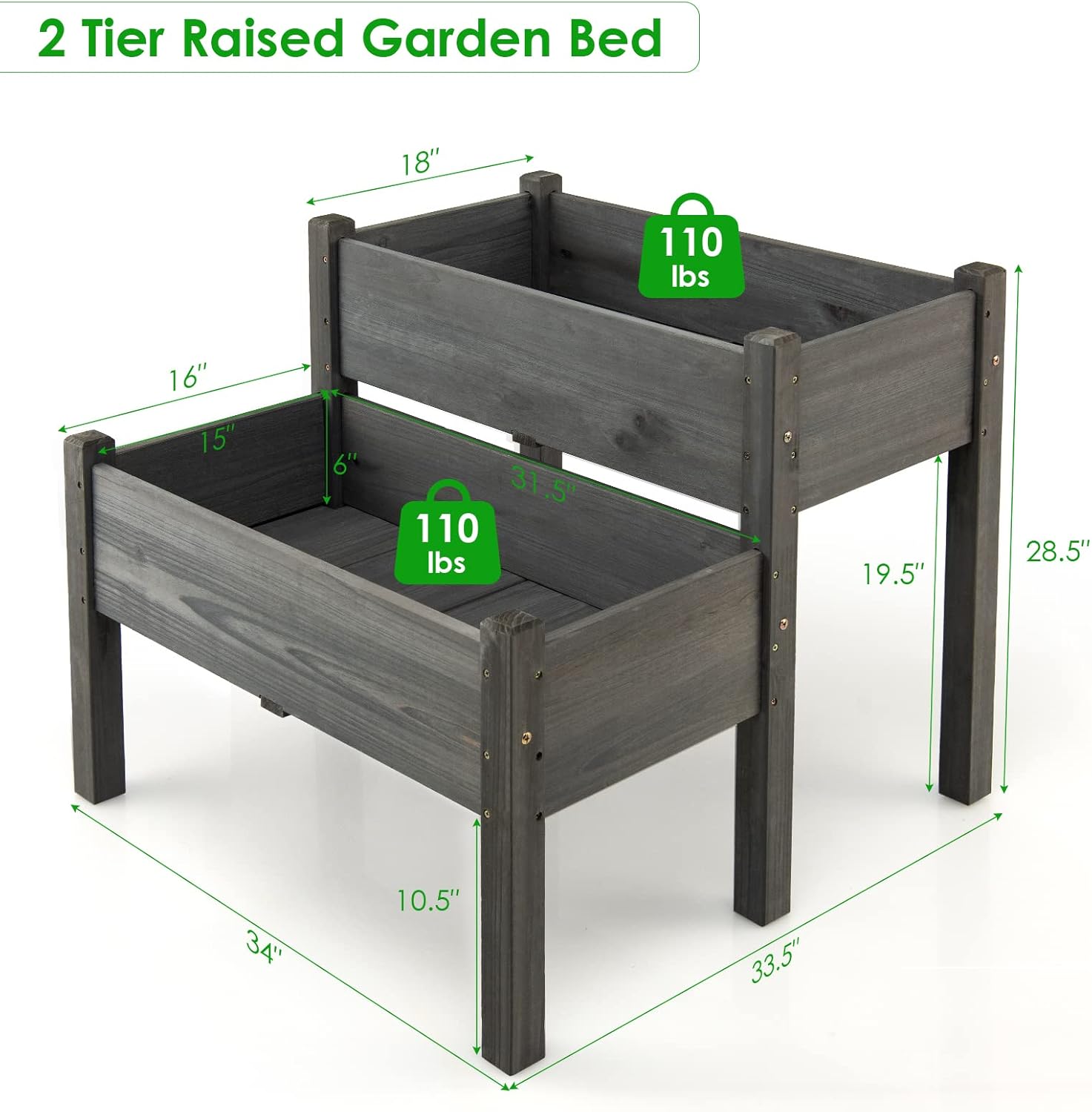 Description:Our raised garden bed is a perfect complement in your garden!The double layer design of the raised garden beds makes it easy to keep your private garden organized, with two 31.5"x 15" x 6.5" planter boxes providing ample space for your flowers, vegetables and herbs. In addition, the raised design of the garden boxes with legs ensures that you can easily care for plants without bending over or straining your body, and prevents small animals from damaging your plants. Made of solid fir wood, it is stable and durable, and can support 110 lbs per box. In addition, the natural texture of the garden bed makes it perfect for your garden, yard, deck. And the simple structure can ensure quick assembly.Features:2 tier large planter box ideal for grow different plantsEquipped with 8 drain holes to promote water drainageSelected fir wood is waterproof and durable for long-term useThickened wooden legs enhance the overall stabilityElevated design prevent animals damage your plantsCompact design suitable for many spacesEasy to assemble with clear instruction manualSpecifications:Color: GreyMaterial: Natural Fir WoodDimensions: 34'' x 33.5''x 28.5'' (L x W x H)Net Weight: 29.5 lbsCapacity: 3.5 cubic ftWeight Capacity: 110 lbsPackage includes:1x Raised Garden Bed;1x InstructionWhy You Choose Our Raised Garden Bed?√Featuring with 8 drainage holes to promote water drainage and plant growth√2 tier planter box provide larger planting space to grow different kinds of plants