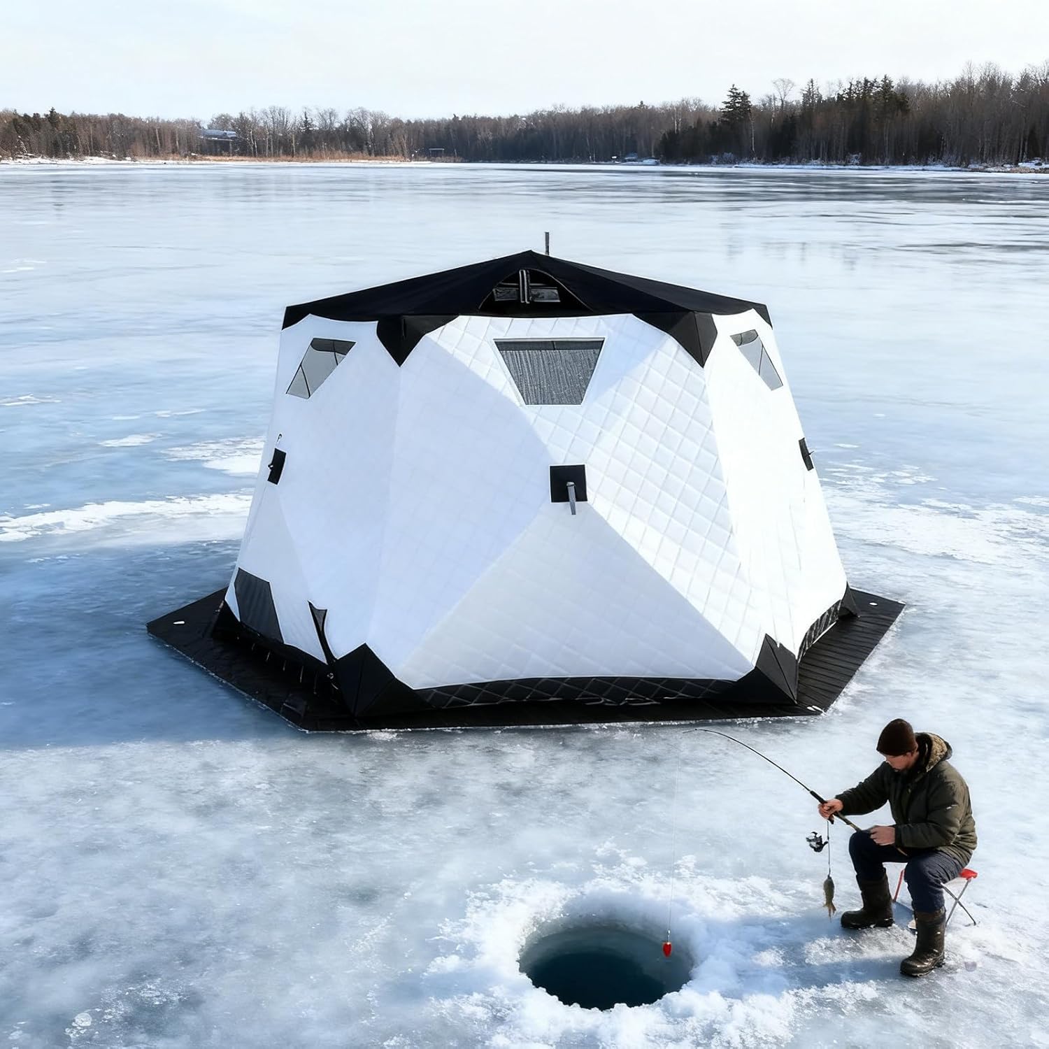 ☃Why Let Winter Stop You? Fish in Warmth and Comfort with Our Portable Hub.☃Features:1. Comfortably accommodates 6-10 people, providing ample interior space.2. Made of 420D insulated Oxford cloth, effectively resisting wind, snow, and rain.3. Mesh screen + plastic windows + cotton windows, providing flexible visibility and light control.4. Compact size when folded and comes with a portable bag for easy storage and transport.☃Describe:Name: Winter fishing tentSur-face fabric: 420D Oxford clothInner fabric: 210D Oxford clothFilling: hollow cotton 220g/㎡Support rod: 11mmWeight (including packaging): about 20kgExpanded dimensions: diagonal approximately 330cm; inner height approximately 180cm☃Product List:1* fishing tents6* Ice nails6* Windproof rope☃NOTICE:1. Due to the different colors of brightness and light, the actual color may be slightly different from the picture.2. Due to manual measurement, allow errors of 0-2 cm. Thank you for your understanding.3. If you have any questions, please contact us and we will answer them within 24 hours.